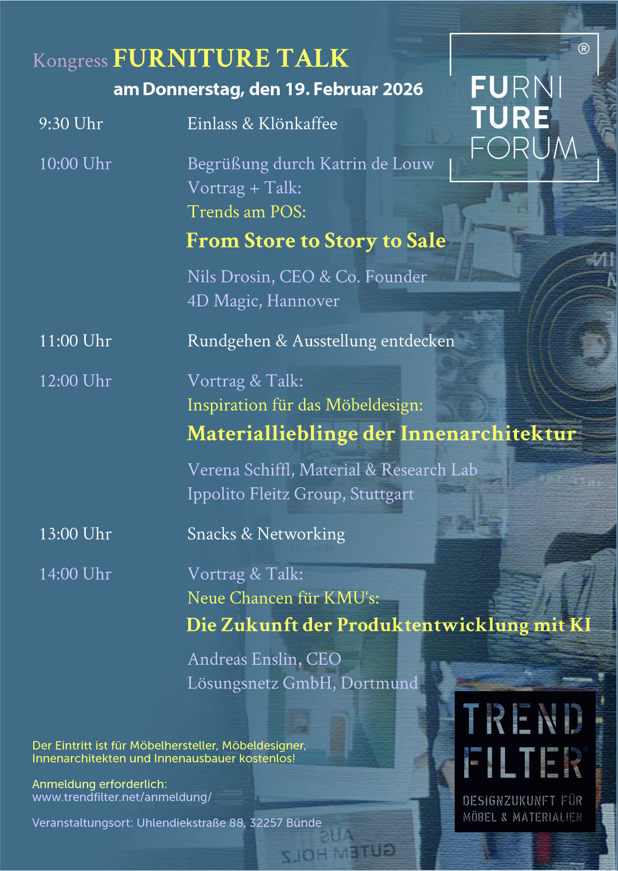 Die Teilnahme an diesem hochkarätigen Kongress geschieht nur auf persönliche Einladung und ist für Entwickler und Designer der Möbel- und Küchenmöbelindustrie, Innenarchitekten und Innenausbauer, sowie Möbelhändler kostenlos. Einen Gutscheincode erhalten Sie, wenn Sie bei uns im Einladungsverteiler gelistet sind. Die Gutscheincodes versenden wir in 2 Wellen Anfang Januar und Anfang Februar 2026. Sie haben trotzdem keinen Gutscheincode erhalten? Dann schnell mal bei event(at)trendfilter.net nachfragen, was da los ist! :)