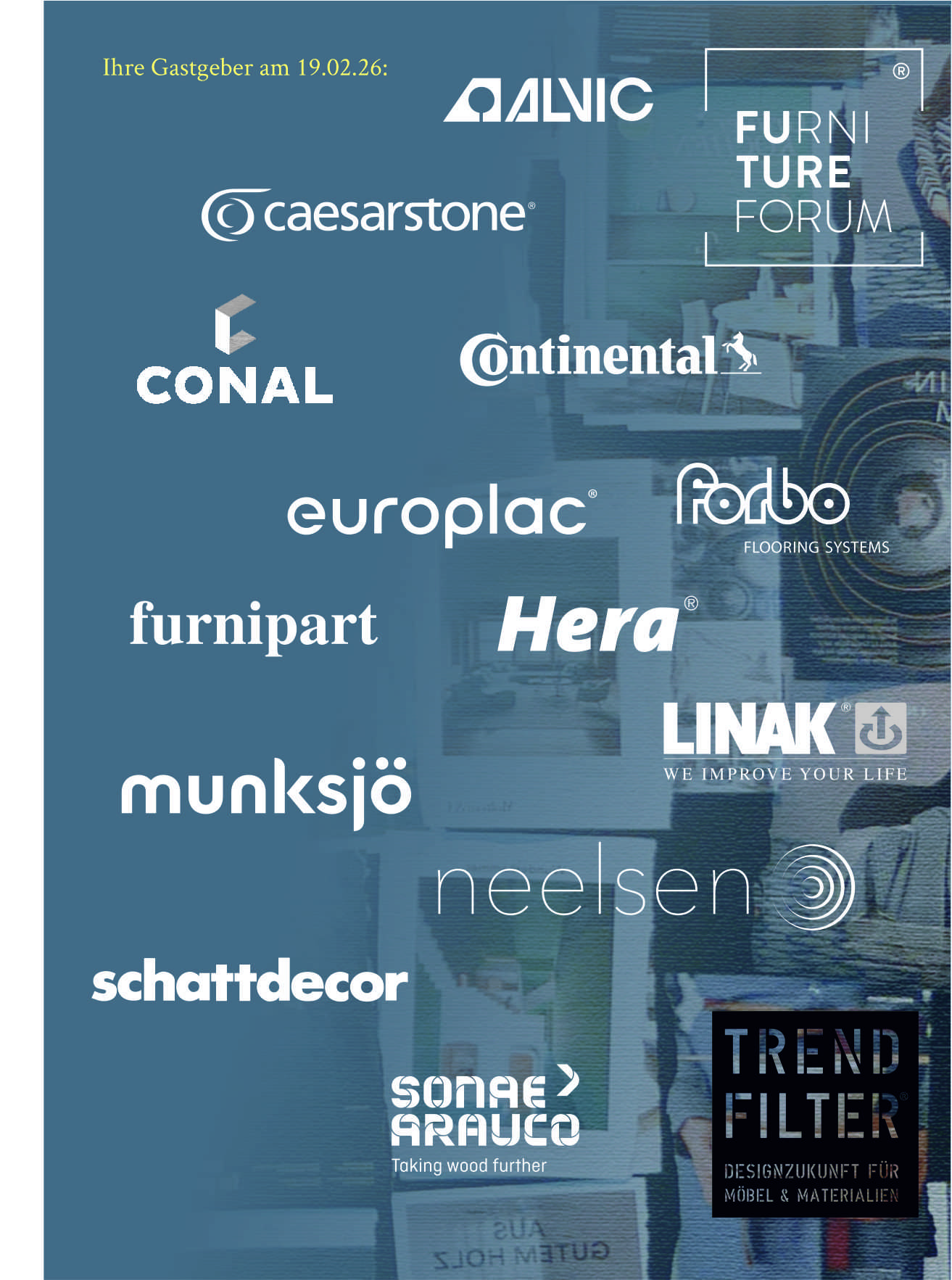 Wie immer gibt es zwischen dem Programm Pausen zum Staunen und Netzwerken, denn die Netzwerkpartner des Furniture Future Forums haben wieder Neuheiten in die Ausstellung eingepflegt und freuen sich auf den Austausch. Ihre Gastgeber sind: ALVIC, CAESARSTONE, CONAL, CONTINENTAL, EUROPLAC, FORBO, FURNIPART, HERA, LINAK, MUNKSJÖ, NEELSEN, SCHATTDECOR, SONAE ARAUCO, sowie der TRENDFILTER.