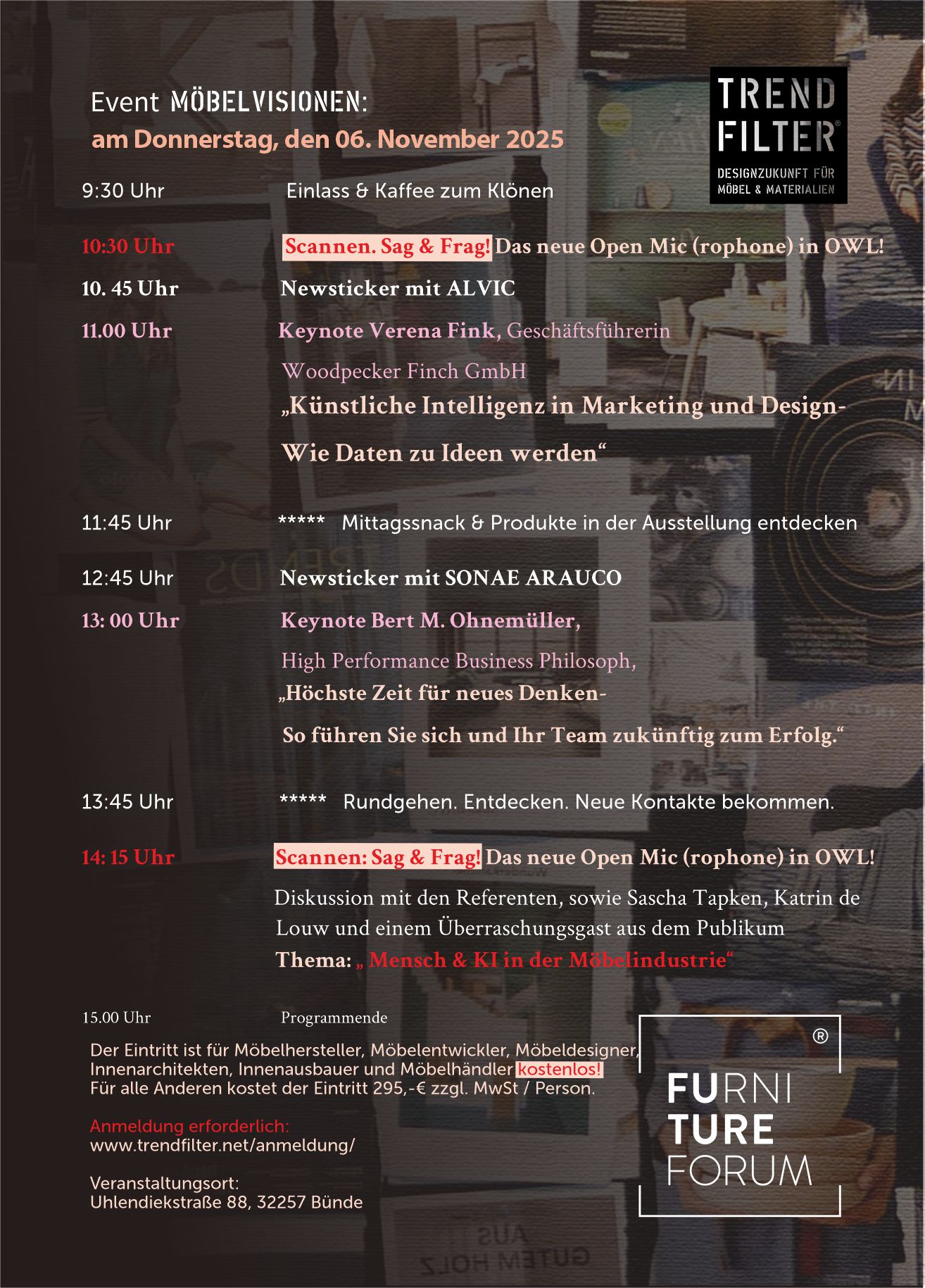 Zu dem diesjährigen Herbstevent MÖBELVISIONEN am 06.11.25 im Furniture Future Forum hat sich das Zulieferernetzwerk wieder etwas ganz Besonders einfallen lassen: Das Open Mic (rophone) für die Einrichtungsbranche! Hier können alle bereits vor dem Event aber auch währenddessen Fragen an die Experten stellen zum Thema: Mensch & KI in der Möbelindustrie. Als Belohnung gibt es einen Eintrittsgutschein im Wert von 295,-€ netto oder sogar einen Platz auf dem Podium zur Diskussion!