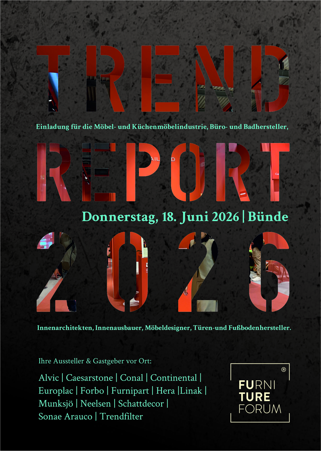Alvic, Caesarstone, Conal, Continental, Europlac, Forbo, Furnipart, Hera, Linak, Munksjö, Neelsen, Schattdecor, Sonae Arauco sowie Trendfilter und das COLORNETWORK.